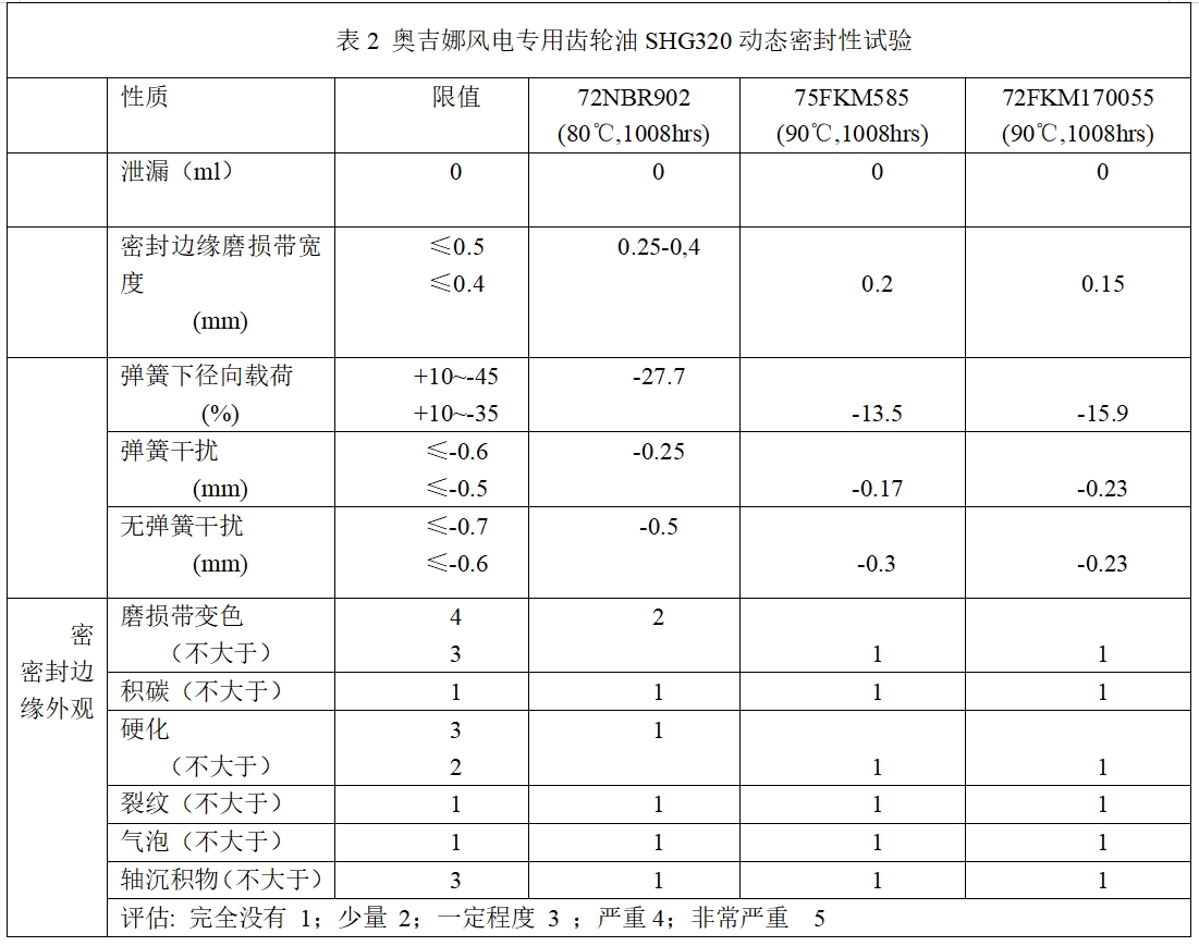 鑒于此,作為世界主要風機齒輪箱制造商的弗蘭德公司,在其對潤滑油產品認證評定過程中,采用靜態潤滑油相容性測試方法的同時,更加注重動態條件下潤滑油橡膠相容性的測試,其所認證的潤滑油必須滿足Freudenberg試驗要求《Static and dynamic oil compatibility tests with Freudenberg Simmerrings for the approval for Flender gearbox applications》 ,此試驗方法為Freudenberg公司和FLENDER公司共同開發,在轉速為1500轉/分鐘的試驗機內,通過測試前后,潤滑油的泄露體積,密封邊緣的磨損帶寬度,軸磨損深度,積碳,起泡,裂紋等現象的觀察和測量評估潤滑油對橡膠的相容性,能夠更好的模擬風電齒輪油實際運行狀況,是目前評定潤滑油相容性最科學、最合理的方法。