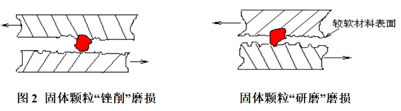 “研磨”磨損是指兩個相對運動部件的間隙中,進入與間隙尺寸相近的硬質(zhì)顆粒。部件運動時,硬質(zhì)顆粒與運動部件表面相接觸,像研磨劑一樣對所接觸的配合表面起著磨削作用,使配合面損傷。這種磨損是油液系統(tǒng)中主要的磨損形式。見圖2所示。